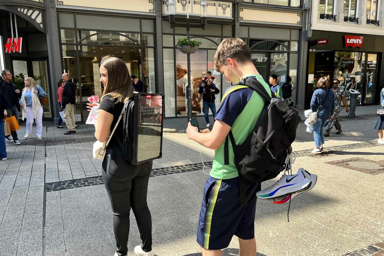 Pour relayer le jeu interactif sur le « terrain », c-a-d en centre-ville, il nous fallait un support à la fois digital et mobile. Le sac à dos digital était une évidence ! LIFE EXPO nous a fourni la vidéo promotionnelle qui allait être diffusée sur nos écrans et de notre côté nous avons conçu un jeu interactif dont l’objectif était de gratter de façon digitale une carte qui révélait l’éventuel gain.