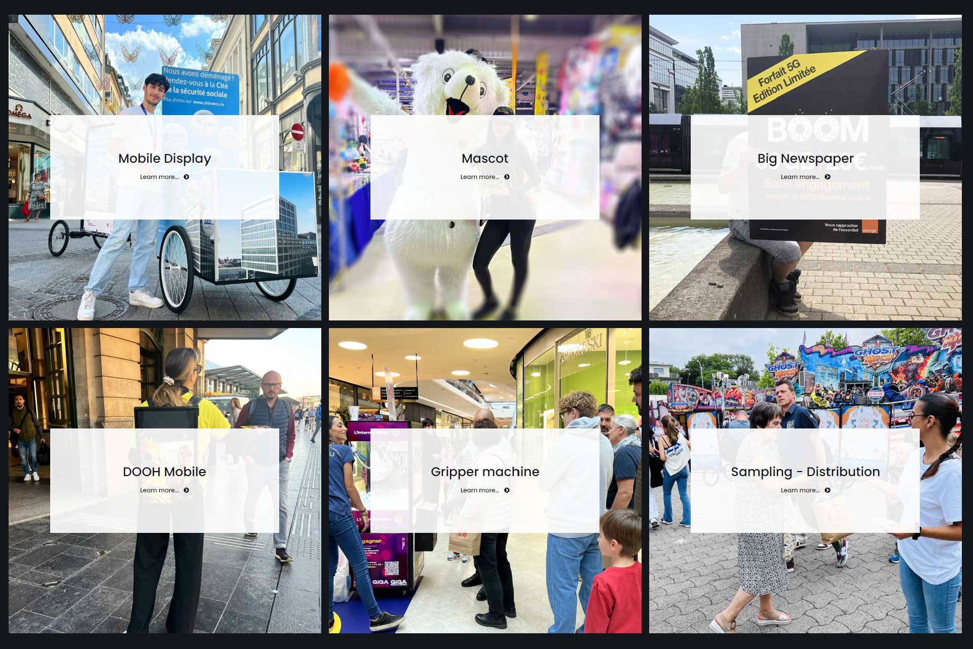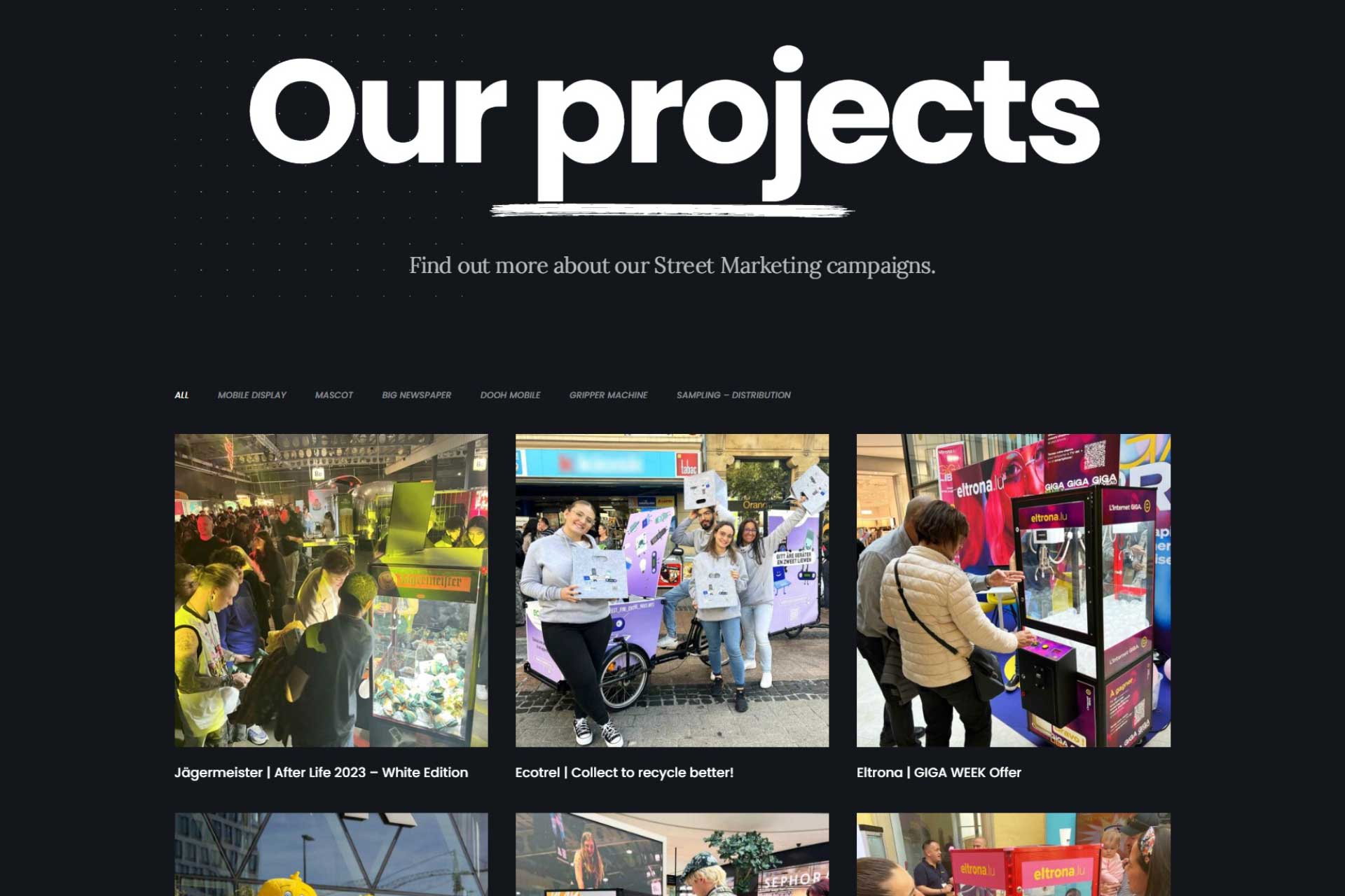 Street marketing is above all actions on the ground! This is why we designed our new site around the case studies carried out . For example, for each “Service” page, we have associated the corresponding customer achievements so that you see a concrete illustration of the service presented. You also have the possibility to consult all of our case studies with the possibility of filtering them by service.