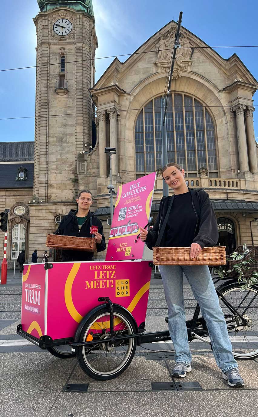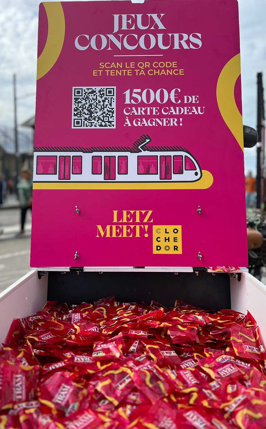 Our hosts were tasked with informing visitors of the day about the arrival of the tram in front of the shopping center and encouraging them to play the competition organized by Cloche d’Or Experience.