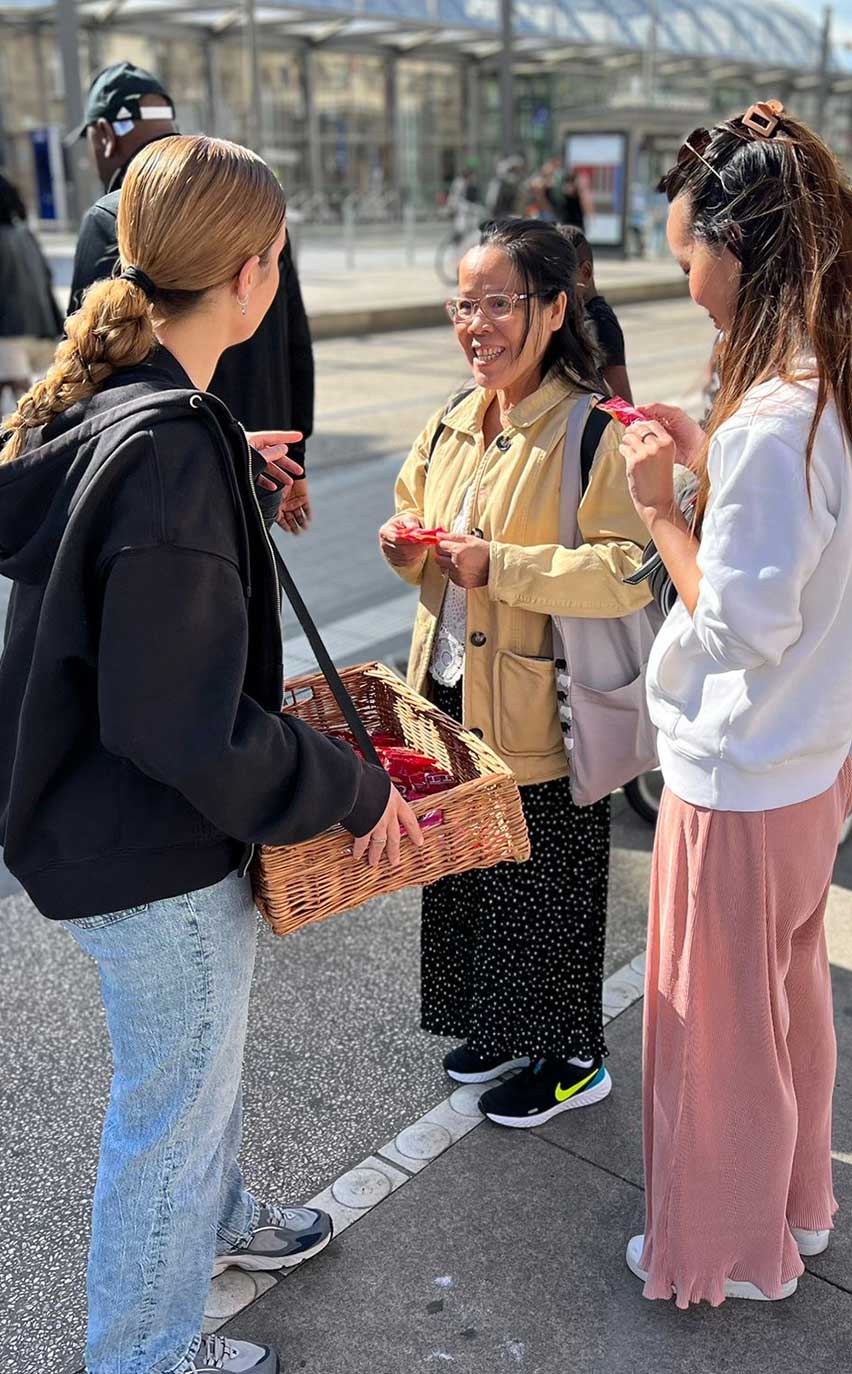 A street marketing device was deployed on the side of the station and city center for this occasion distribution of bags of sweets, a mobile display pulled by a tricycle (for the storage of sweets) … all branded with the image of the shopping center.
