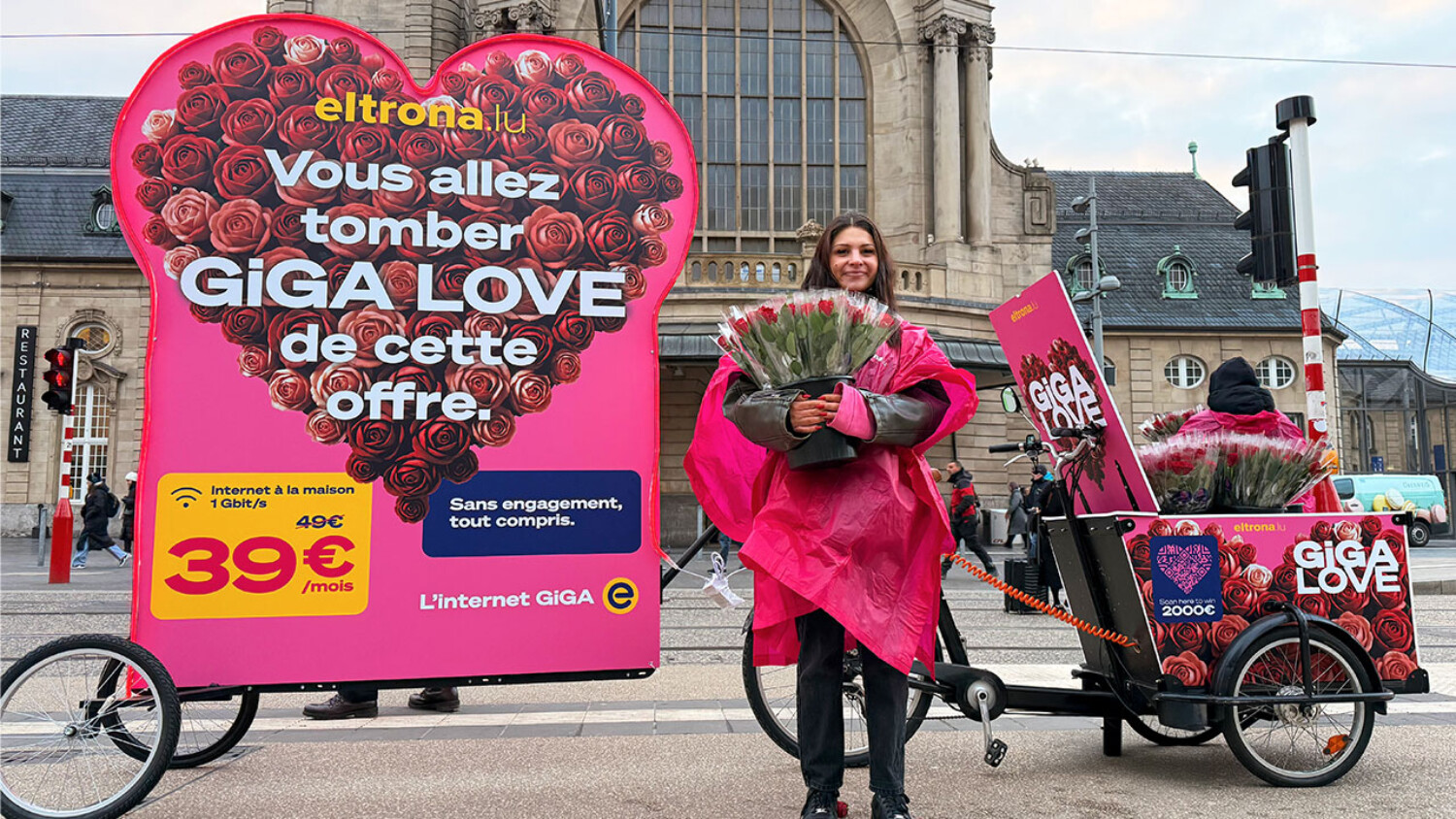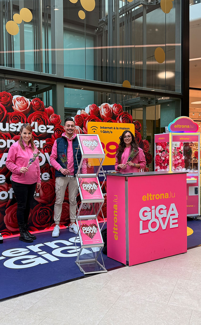 Our dedicated staff, dressed in GiGA LOVE colours with pink ponchos, created a warm and immersive atmosphere, while demonstrating exemplary professionalism. Their main mission? Distribute 8,000 roses with a QR code leading to an exclusive competition, with a chance to win €2,000. Thanks to their positive attitude, their infectious enthusiasm and their ability to engage in dialogue, our teams were able to capture the attention of passers-by and generate a high participation rate. With an innovative custom-made mobile display and eye-catching neon lights, Eltrona lit up this special day, captivating passers-by from the first glance.