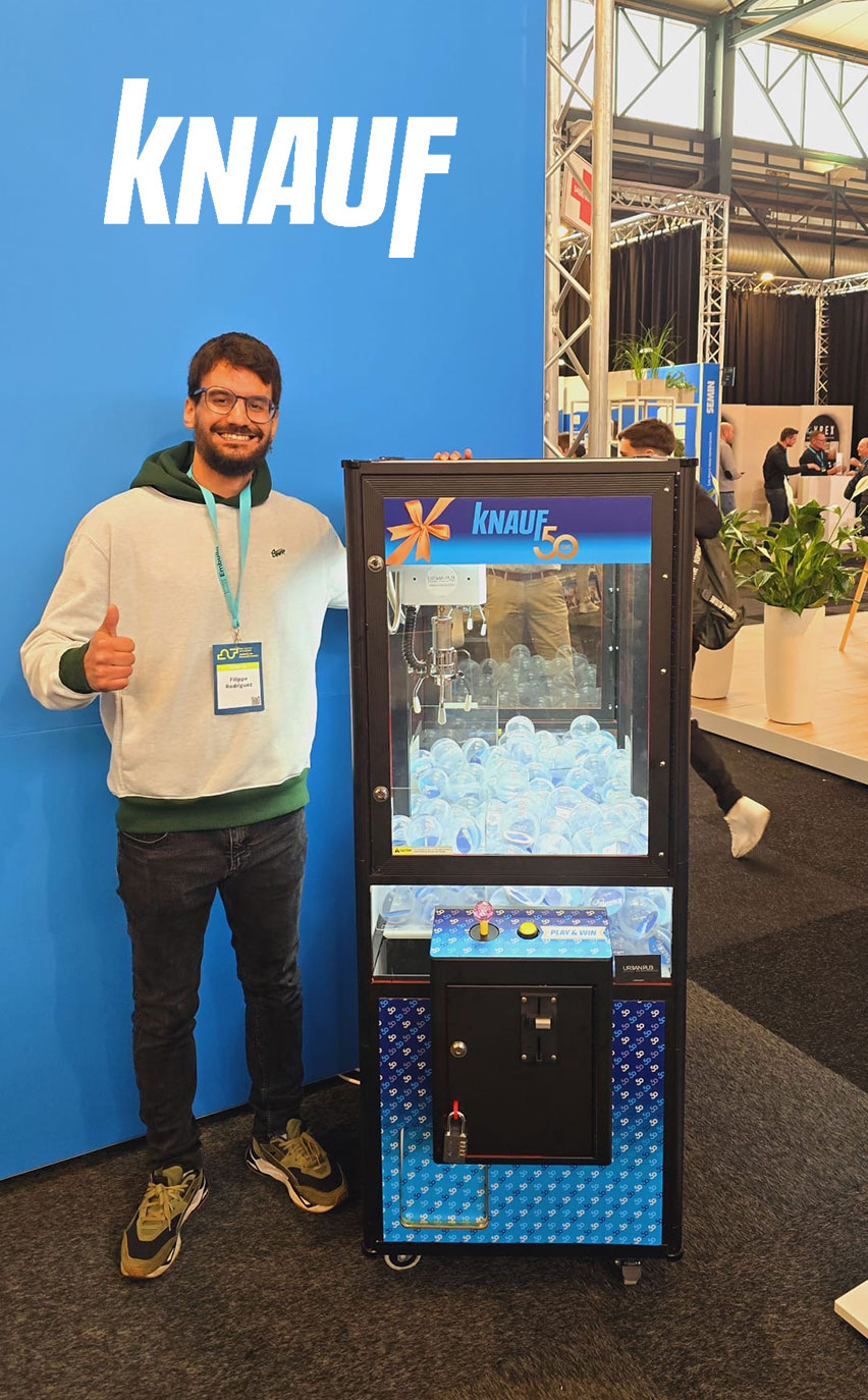 During the Completion Day at the Brussels Kart Expo (15/10), Urban Pub had the honor of collaborating with Knauf Belgium for an original animation, marking the company’s 50th anniversary. The goal was to create a unique and attractive experience that would attract visitors’ attention and increase traffic to the Knauf stand. To achieve this, we designed a personalized claw machine, in the image of the brand’s anniversary.