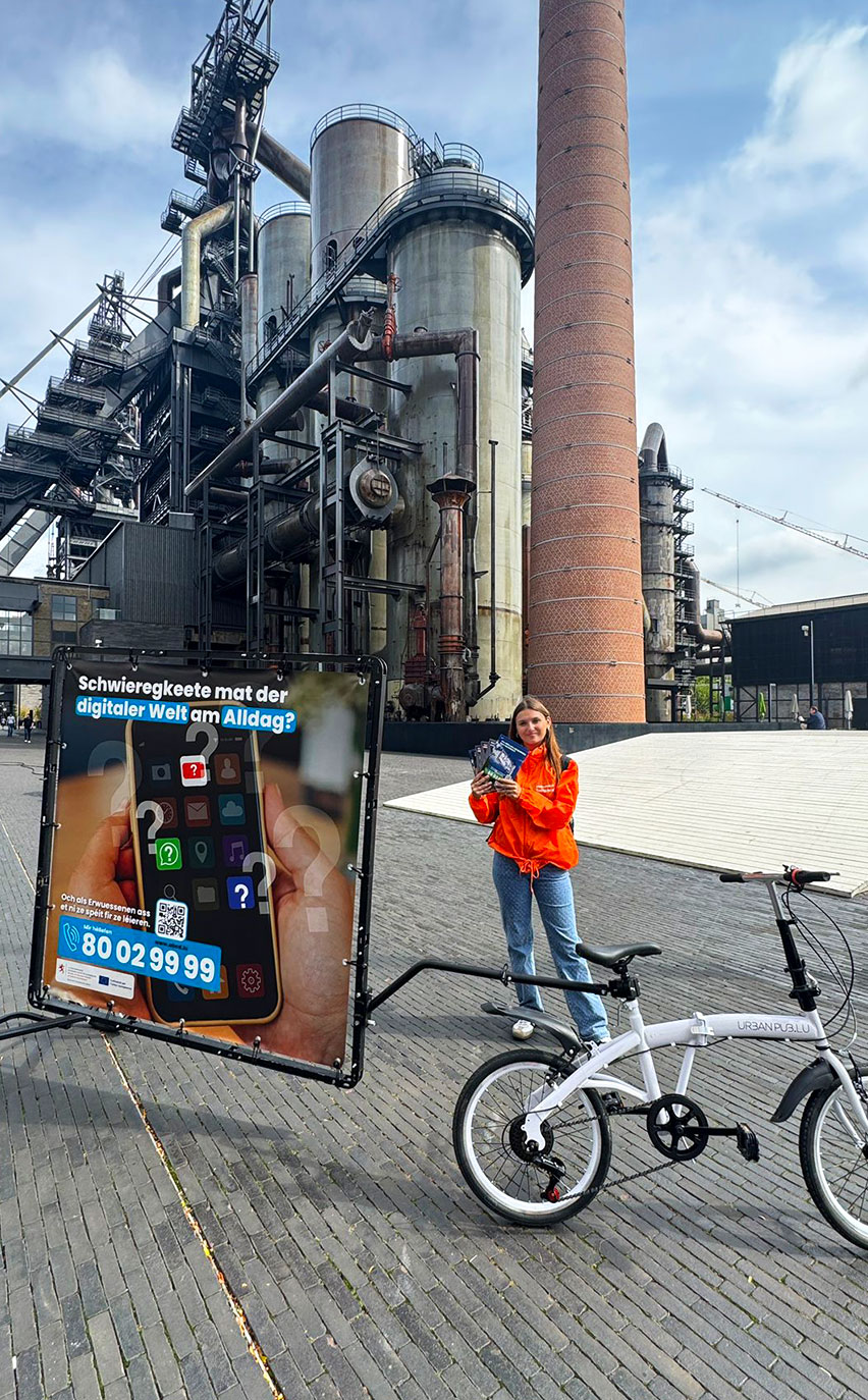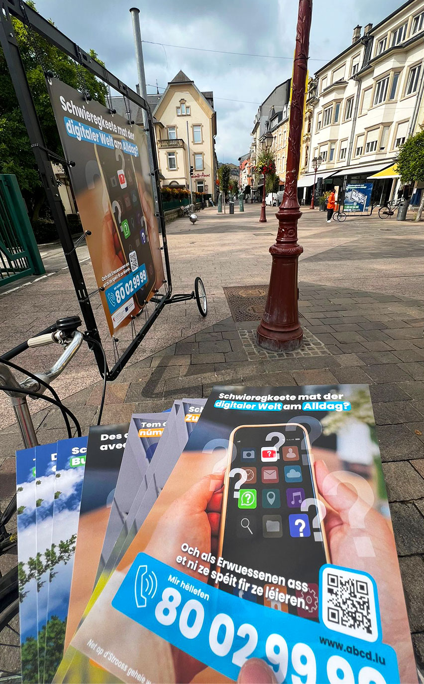 To maximize the impact, our teams invested in several strategic areas of the country (north, center, south) with a complete and visible system: mobile posters towed by bicycle, distribution of flyers and goodies, and the presence of pilots dressed in the colors of the campaign. Thanks to this direct and human approach, URBAN PUB made it possible to effectively reach citizens in public spaces in Luxembourg, by bringing an essential institutional message to where it matters most: in contact with residents.