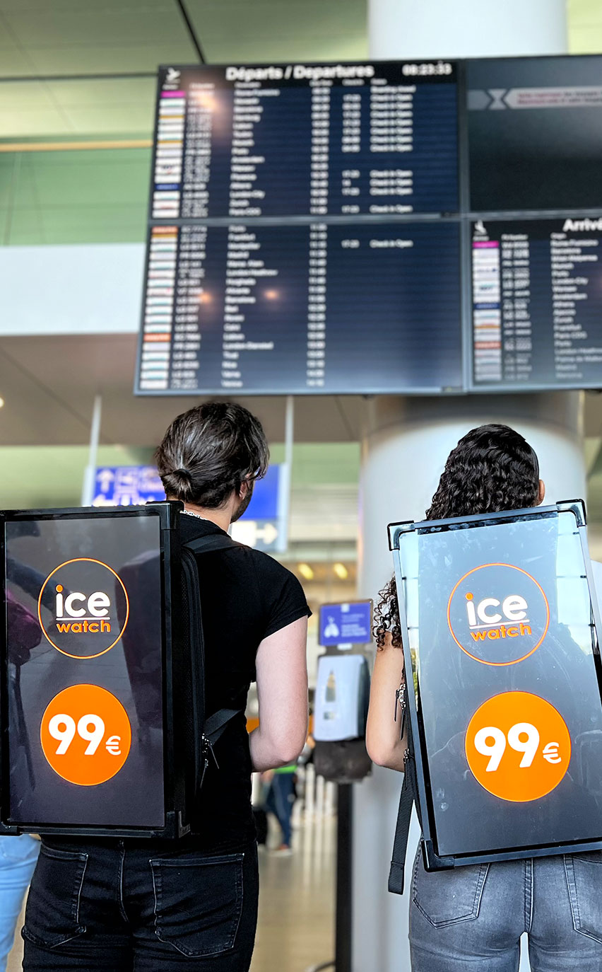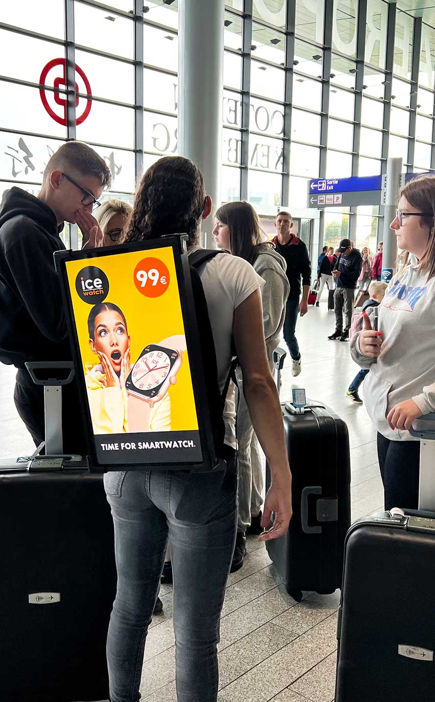 Nos hôtes(sses) circulaient dans les allées de l’aéroport munis d’un sac à dos digital diffusant le message promotionnel de la marque.