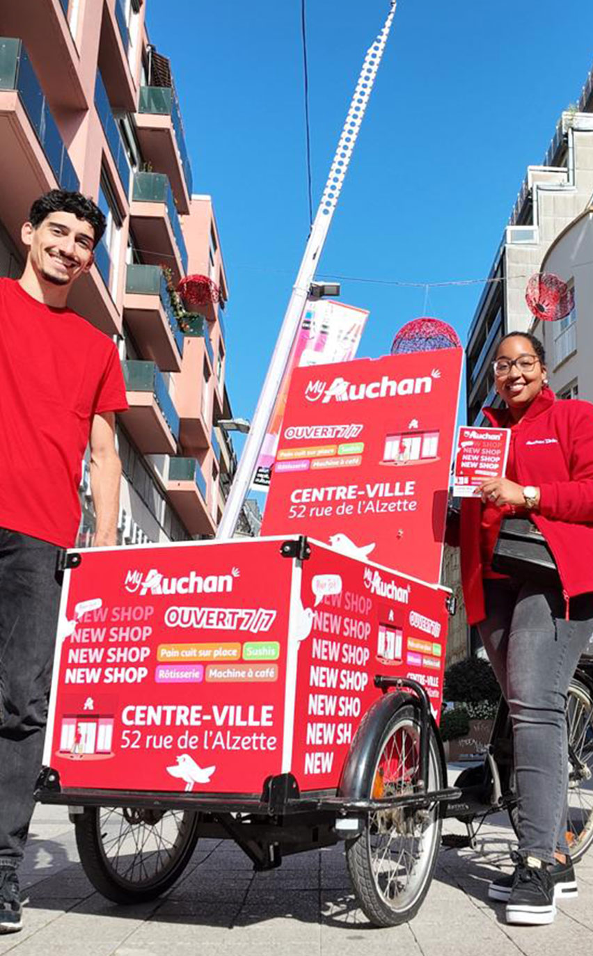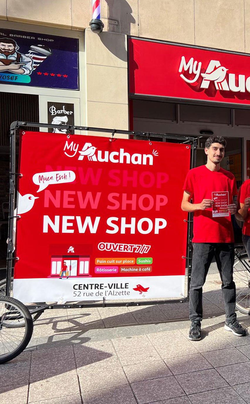 Pour célébrer cette grande ouverture et attirer les habitants, nos promogirls et promoboys ont animé les rues d’Esch avec une énergie communicative, répandant la nouvelle avec sourire et bonne humeur. Pour maximiser l’impact de cette campagne de street marketing, un dispositif d’affichage mobile a été déployé, comprenant des triporteurs et vélos cargo aux couleurs d’Auchan.